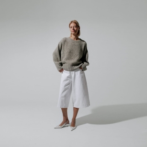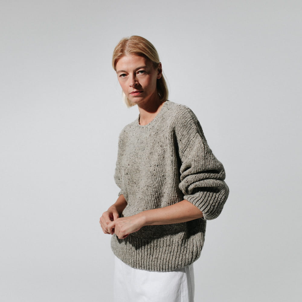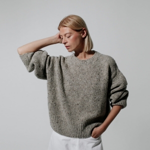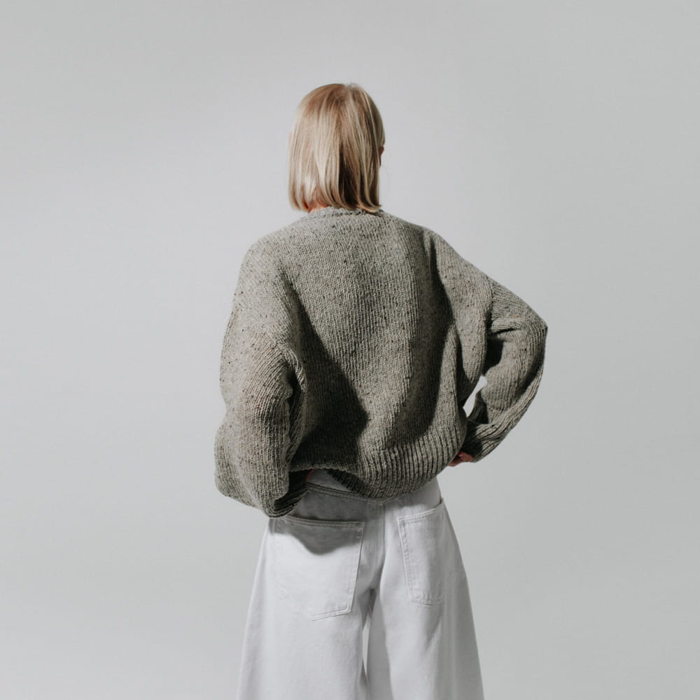 Oversizowy sweter średniej długości. Mięsisty, gruby, z obniżoną linią ramion.