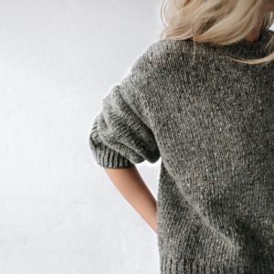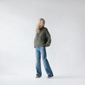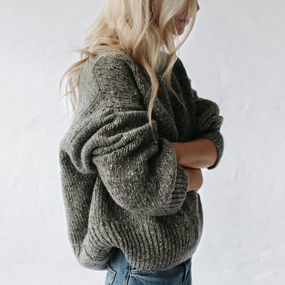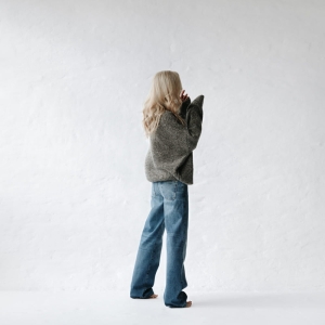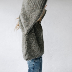 Oversizowy sweter średniej długości. Mięsisty, gruby, z obniżoną linią ramion.